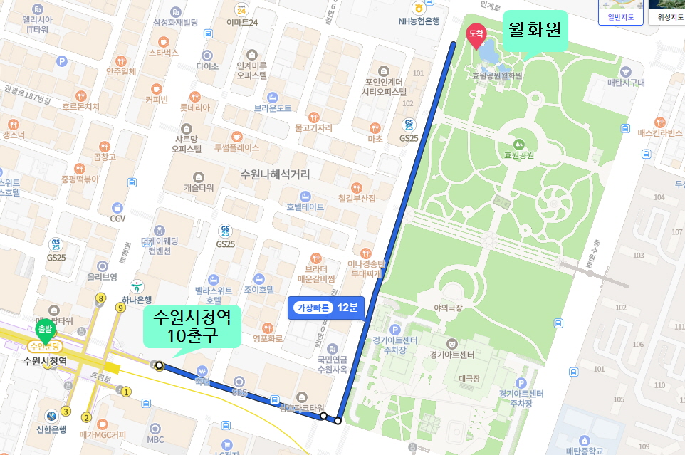 전철 이용 : 수원역- 수원시청역 10번출구 - 도보 1km